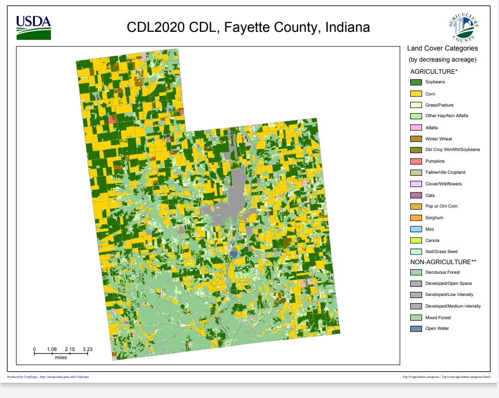 Unlike counties to the north that are dominated by corn and soybeans or counties to the south that are predominantly wooded, Fayette County is 51% percent corn and soybeans. Connersville, the county seat, makes up a vast majority of the 7% of developed land. Wheat, alfalfa, and specialty crops make up approximately 3%. Only 157.4 acres of wetland remain in all 215 square miles. The remainder is made up of forest and pasture (see fig.2) (USDA NASS).
