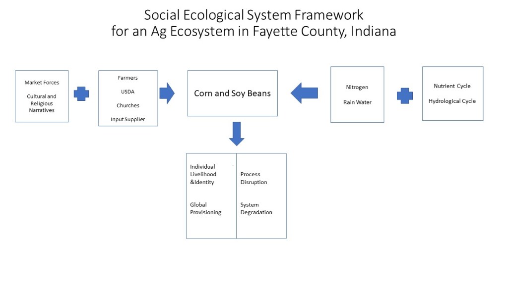 This social ecological system framework for Fayette County, Indiana is based on limited components of it’s dominant ecosystem, row crop production. Market forces and cultural and religious narratives direct the choices of farmers, government agencies, churches, and input suppliers in their land use decisions. These choices may manipulate the natural processes of the nutrient and hydrological cycles. These human and natural elements combine to create an ecosystem that provides global provisioning and individual livelihoods and identities, but this ecological service comes at the costs of process disruption and degradation.